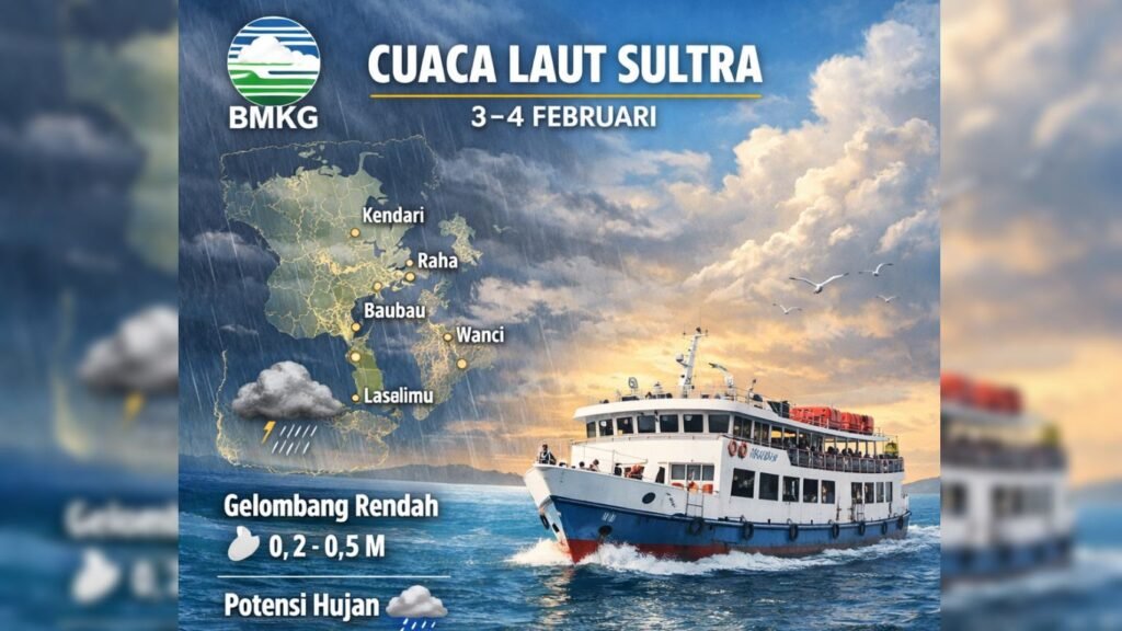 CELEBESPOS.ID, KENDARI – Badan Meteorologi, Klimatologi, dan Geofisika (BMKG) memprakirakan kondisi laut di perairan Sulawesi Tenggara (Sultra) pada 3–4 Februari 2026 secara umum berada dalam kategori aman untuk pelayaran, dengan tinggi gelombang dominan di bawah 0,5 meter. Meski demikian, potensi hujan ringan hingga sedang masih muncul di sejumlah rute, yang dapat mengurangi jarak pandang dan mempengaruhi kenyamanan berlayar.