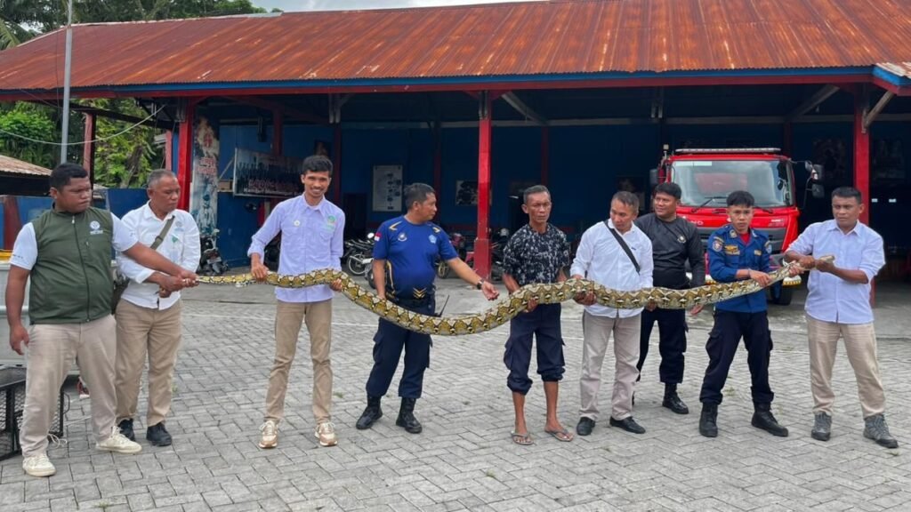 CELEBESPOS.ID, KENDARI — Tim Rescue Dinas Pemadam Kebakaran dan Penyelamatan (Damkarmat) Kota Kendari mengevakuasi seekor ular piton sepanjang sekitar 7 meter yang masuk ke atas plafon rumah warga di Jalan Bunga Kolosua No. 10B, Lorong Blok M, Kelurahan Kemaraya, Kecamatan Kendari Barat, Minggu malam, 8 Februari 2026. Evakuasi berlangsung hampir satu jam dan berjalan tanpa korban jiwa, meski seorang petugas sempat mengalami luka ringan.