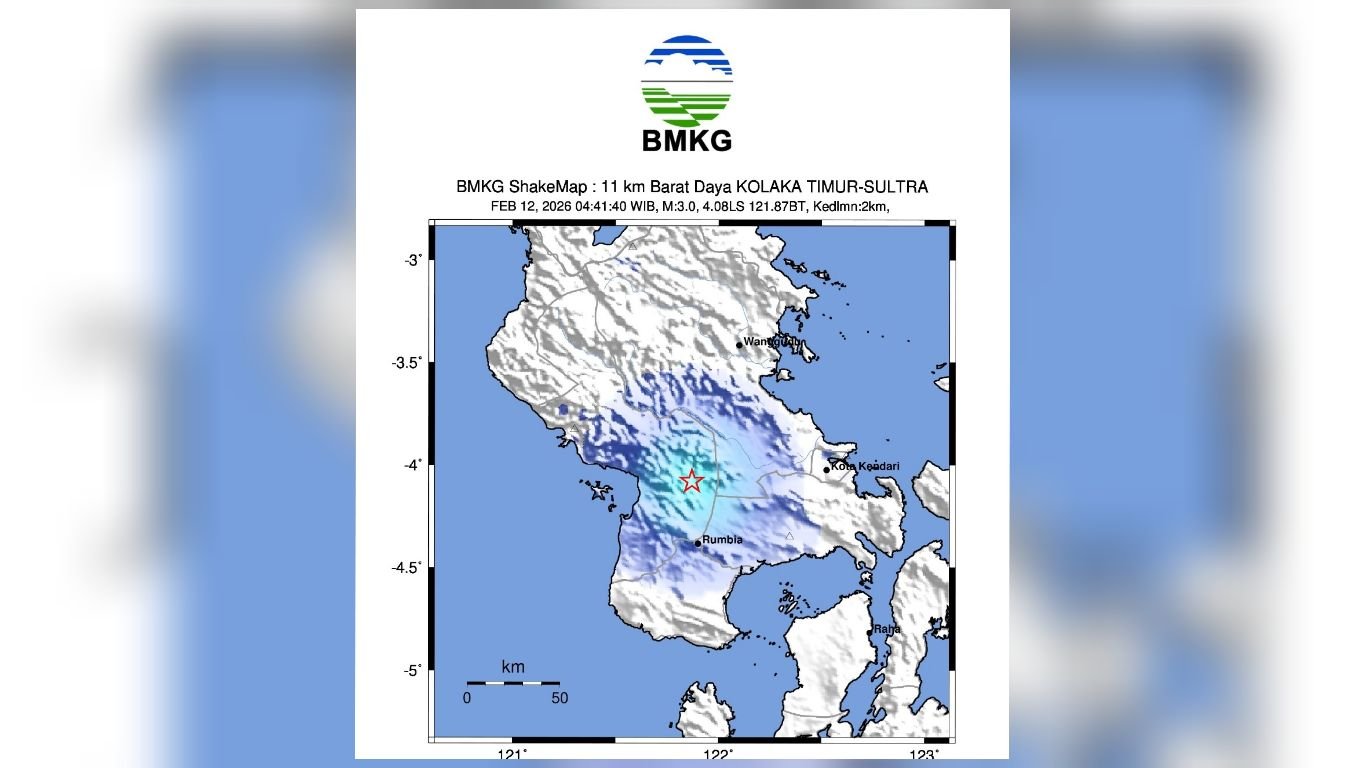 CELEBESPOS.ID, KENDARI — Badan Meteorologi, Klimatologi, dan Geofisika (BMKG) melaporkan gempa bumi tektonik bermagnitudo 3,0 mengguncang Kabupaten Kolaka Timur, Sulawesi Tenggara, pada Kamis (12 Februari 2026) pukul 04.41 WIB. Gempa tersebut dikategorikan sebagai gempa dangkal yang dipicu oleh aktivitas sesar aktif di wilayah setempat.