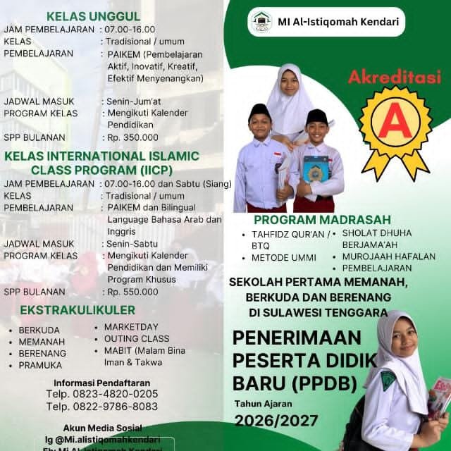 CELEBESPOS.ID, KENDARI — Madrasah Ibtidaiyah (MI) Al-Istiqomah Kendari membuka Penerimaan Peserta Didik Baru (PPDB) melalui penyelenggaraan lomba edukatif bagi anak usia dini tingkat RA, PAUD, dan TK. Kegiatan ini akan digelar selama tiga hari, mulai 29 hingga 31 Januari 2026, sebagai bagian dari persiapan menyambut Tahun Ajaran Baru 2026/2027.