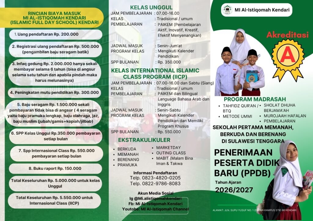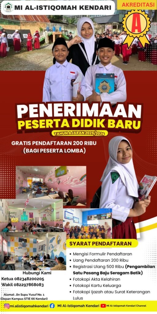 Menjelang Tahun Ajaran Baru 2025/2026, MI Al-Istiqomah Kendari membuka kesempatan bagi masyarakat untuk bergabung dalam ekosistem pendidikan Islam terpadu yang menekankan kualitas, inovasi, dan akhlak.