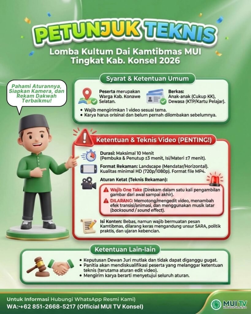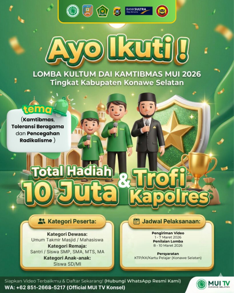 Informasi lebih lanjut dapat diperoleh melalui WhatsApp resmi panitia di nomor 0851-2668-5217 (Official MUI TV Konsel). (red)