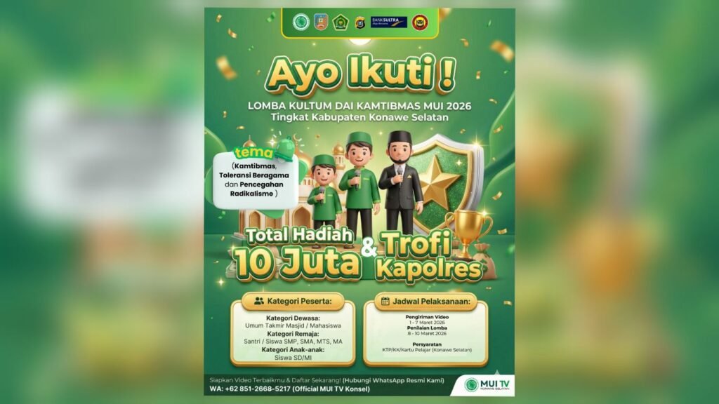 CELEBESPOS.ID, KONAWE SELATAN – Majelis Ulama Indonesia (MUI) Kabupaten Konawe Selatan (Konsel) menggelar Lomba Kultum Dai Kamtibmas Tahun 2026 tingkat kabupaten. Kegiatan ini menjadi bagian dari upaya memperkuat peran dakwah dalam menjaga ketertiban dan keamanan masyarakat melalui pesan-pesan keagamaan yang menyejukkan.