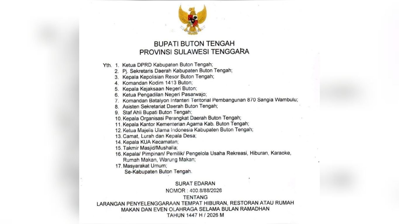 CELEBESPOS.ID, BUTON TENGAH — Pemerintah Kabupaten Buton Tengah (Buteng), Sulawesi Tenggara, resmi menerbitkan Surat Edaran Nomor 400.8/88/2026 tentang larangan penyelenggaraan tempat hiburan, pengaturan operasional rumah makan, serta pembatasan kegiatan tertentu selama Bulan Ramadan 1447 Hijriah/2026 Masehi.