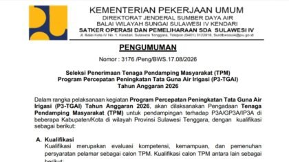 CELEBESPOS.ID, JAKARTA – Pemerintah kembali membuka peluang bagi masyarakat untuk terlibat langsung dalam pembangunan sektor irigasi melalui rekrutmen Tenaga Pendamping Masyarakat (TPM) dalam Program Percepatan Peningkatan Tata Guna Air Irigasi (P3-TGAI) Tahun Anggaran 2026.