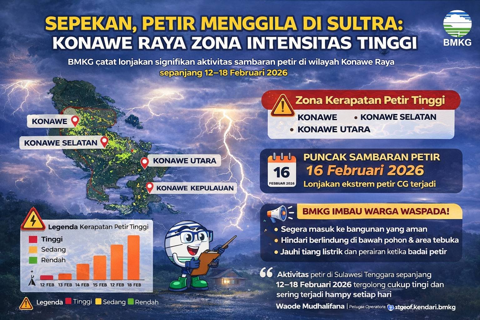 “Selama periode 12 hingga 18 Februari 2026, aktivitas petir di Sulawesi Tenggara tergolong cukup tinggi dan terjadi hampir setiap hari. Puncak sambaran petir CG tercatat pada 16 Februari,” ujar Waode, Jumat, 20 Februari 2026.